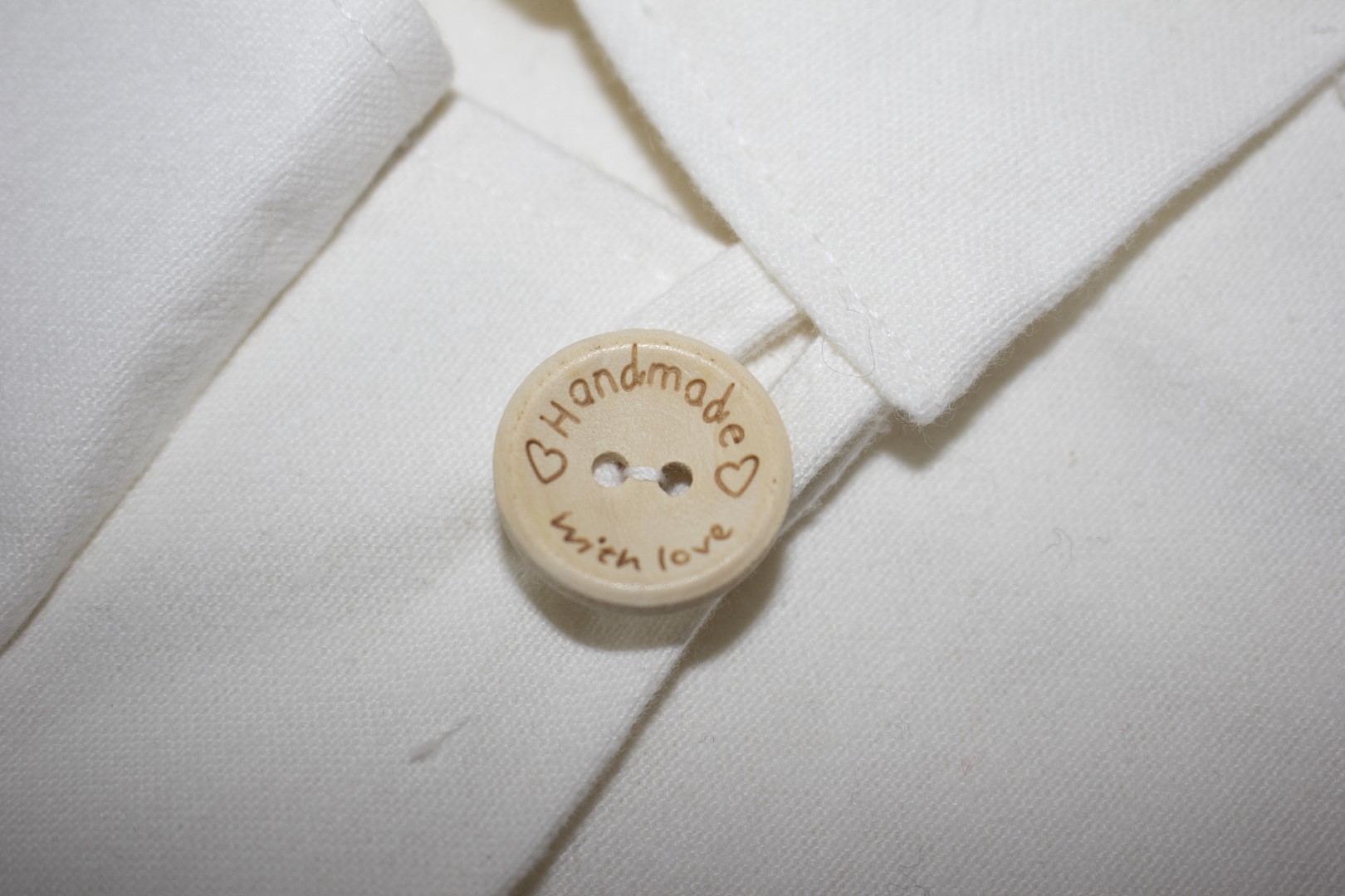 NB: De grotere maten zijn voorzien van een houten sluitknoopje bij de mouwmanchet, iets kleiner dan het knoopje op de rug.