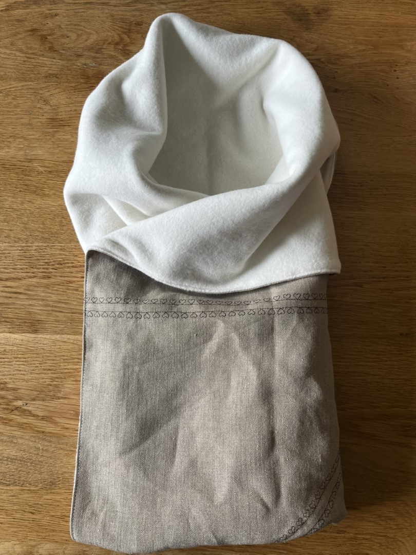 De binnenkant is 100% katoenen fleece. Deze biologische katoen is geteeld en verwerkt in Turkije. De witte versie is ietsje ontkleurd. Daarna is de 100% katoenen weving opgeruwd tot een zachte warme en knuffelbare fleece. De aaibare binnenkant past bij de zachtheid van een baby. De buitenzijde is van Belgisch linnen. De gebruikte vlas heeft gegroeid in Nederland, Belgie of Noord-Frankrijk. Het is een zeer lokaal linnen product. Hier is gekozen voor de ongewassen linnen versie, dat betekent dat dit linnen de minste bewerkingen heeft gehad. Ongewassen linnen voelt wat ruwer aan en past bij het rauwe verdriet.