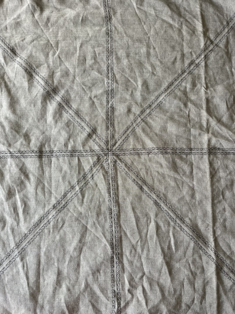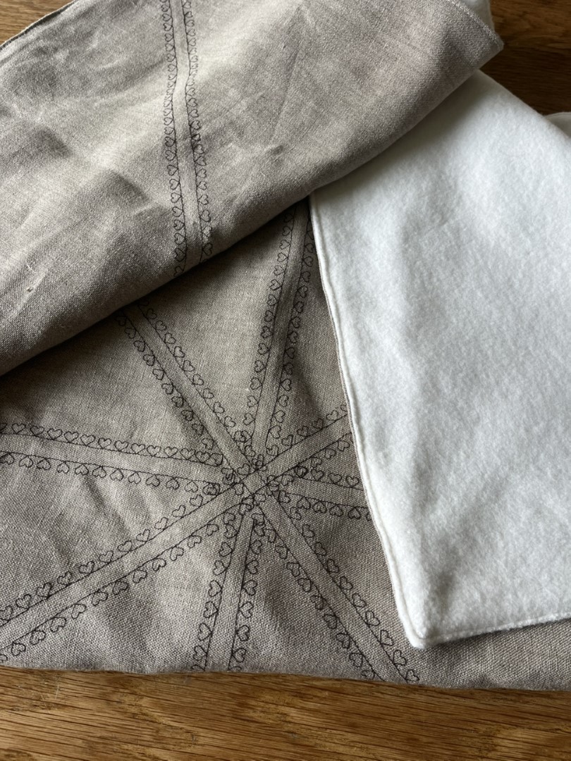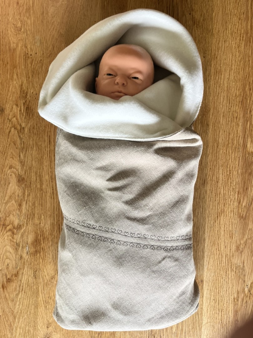 Een stilgeboren kindje wordt ingebakerd in een binnenkant van zachte fleece wat omgeven is door het linnen. De linnen buitenzijde is, met gebruikt van zwarte of donkerbruin 100% katoenen garen, in een siersteek van hartjes met de naaimachine bewerkt. Deze hartjeslijnen vormen samen een sterretje. Ook de verdere afwerking is met katoenen garen gedaan zodat de wikkeldoek volledig duurzaam en biologisch afbreekbaar is.